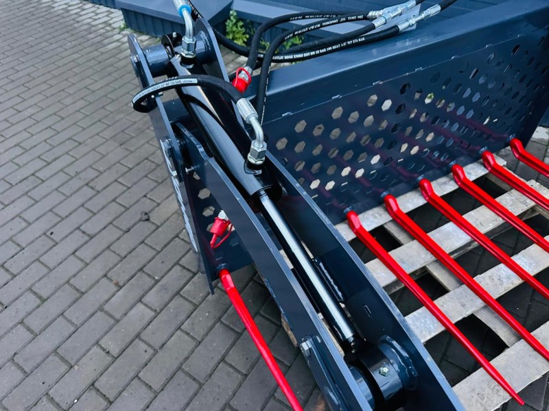 Основу захвата составляет прочная рама из металла, которая крепится к погрузчику или фронтальному навесному оборудованию трактора. Два гидроцилиндра обеспечивают равномерное сжатие зубьев, что создает достаточное усилие для работы даже с промерзшим силосом зимой. Зубья окрашены в красный цвет для лучшей видимости, а их форма и расположение продуманы так, чтобы материал надежно удерживался во время транспортировки.